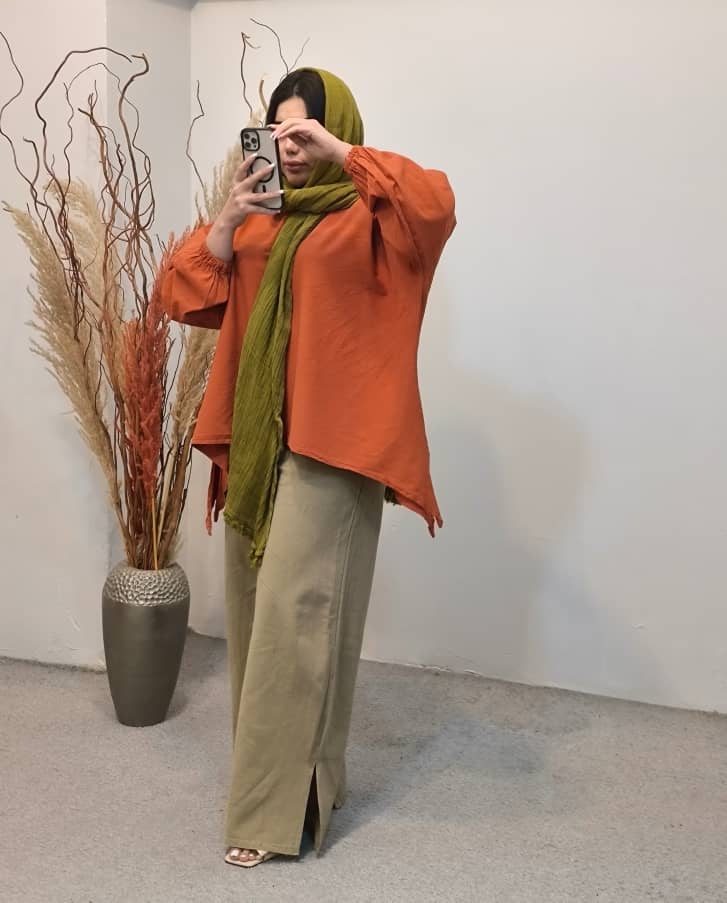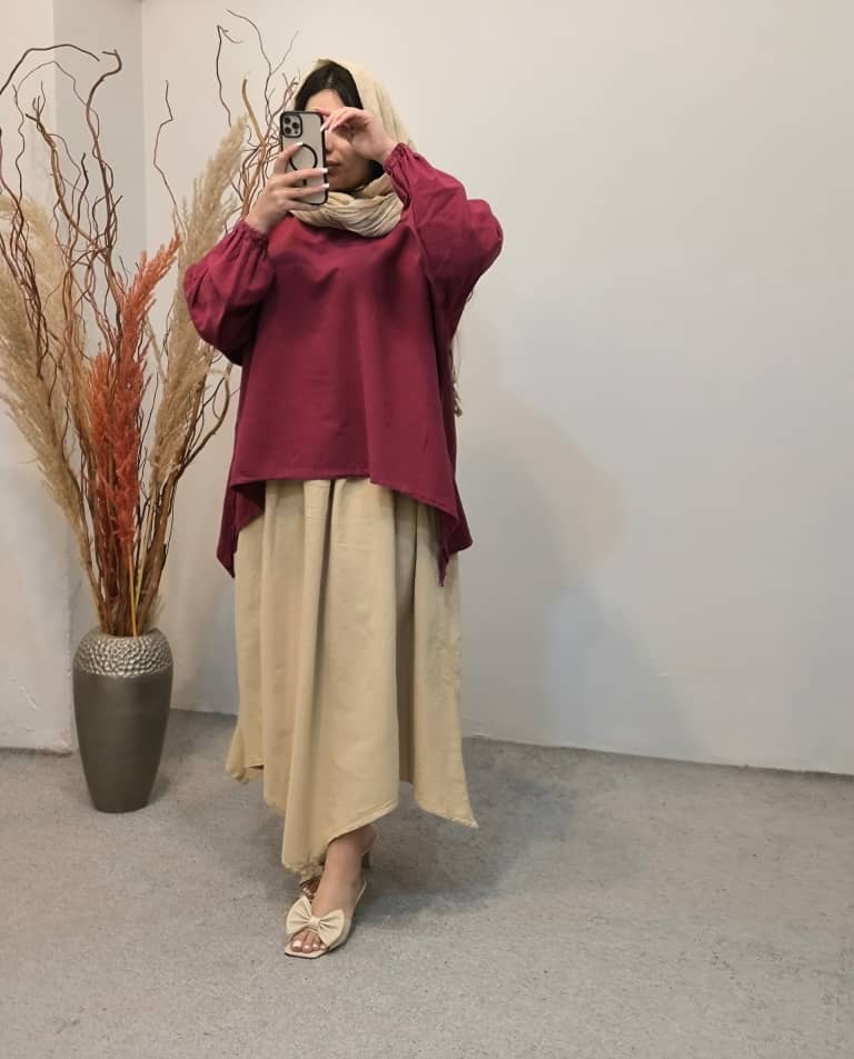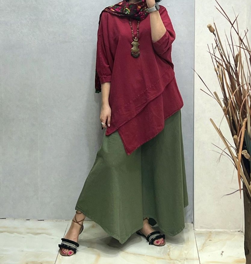تونیک هنری الیاف طبیعی فری سایز به علت مدل آستین از شاسز ۳۸ تا سایز ۵۲ مناسب هست در رنگبندی قرمز آجری استخونی سفید مشکی
